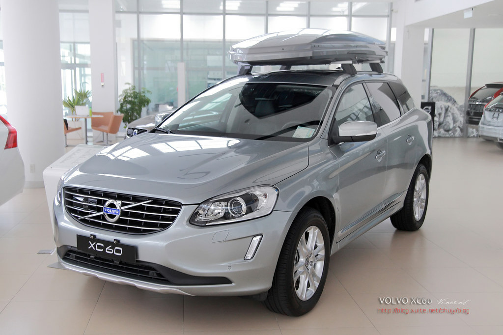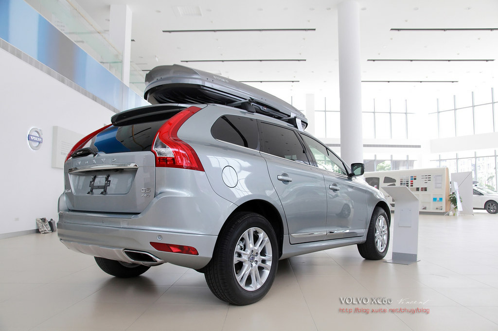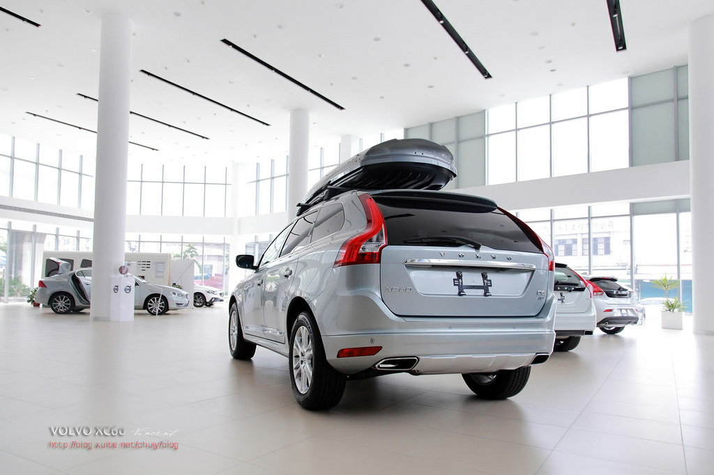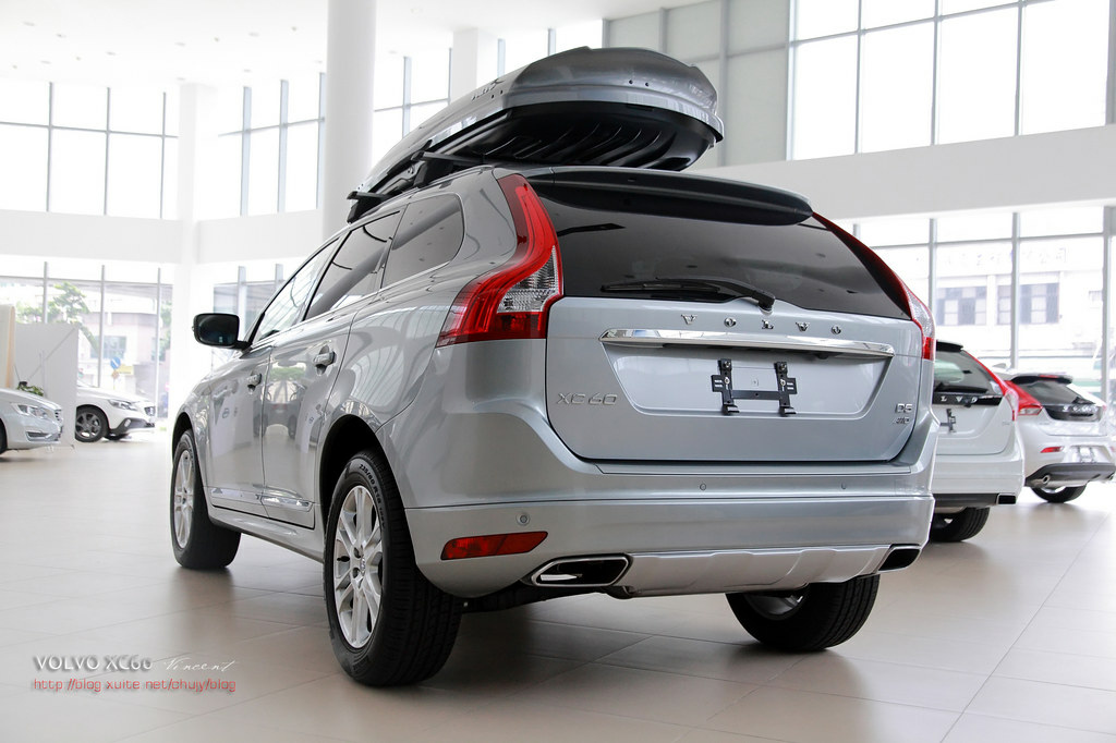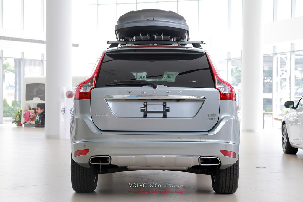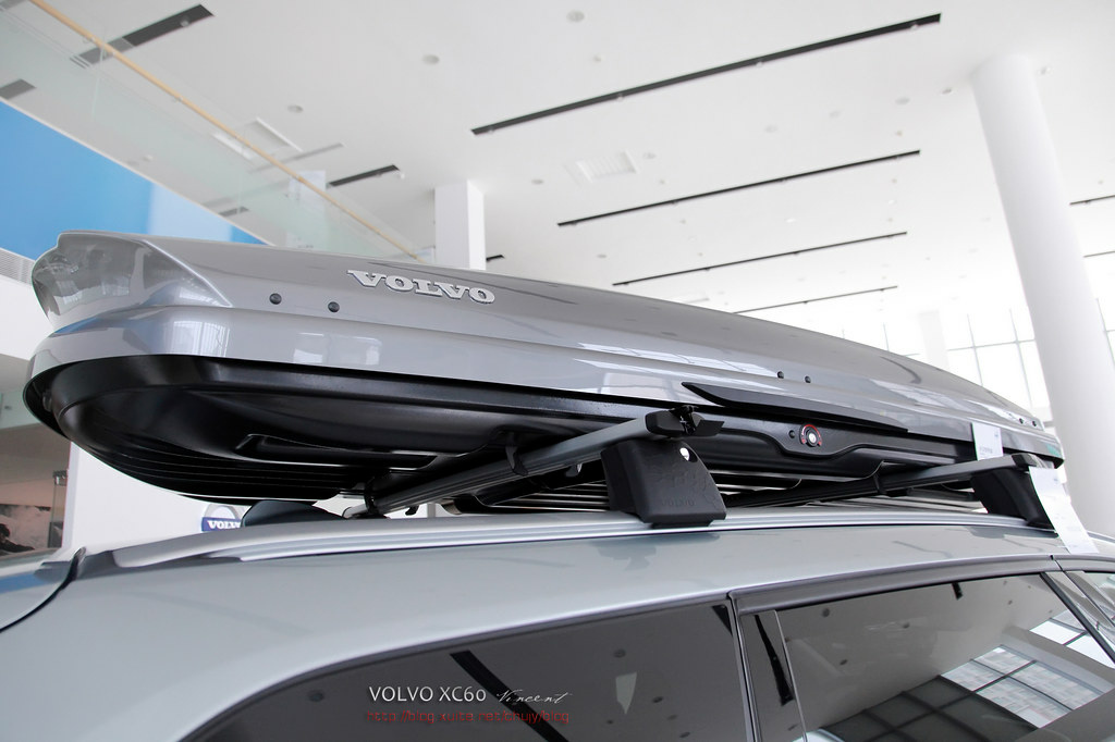 本車型為 XC60 D5 旗艦款, 上方搭載了車頂架和置物盒, 這感覺就是要去郊遊露營去的休閒風阿